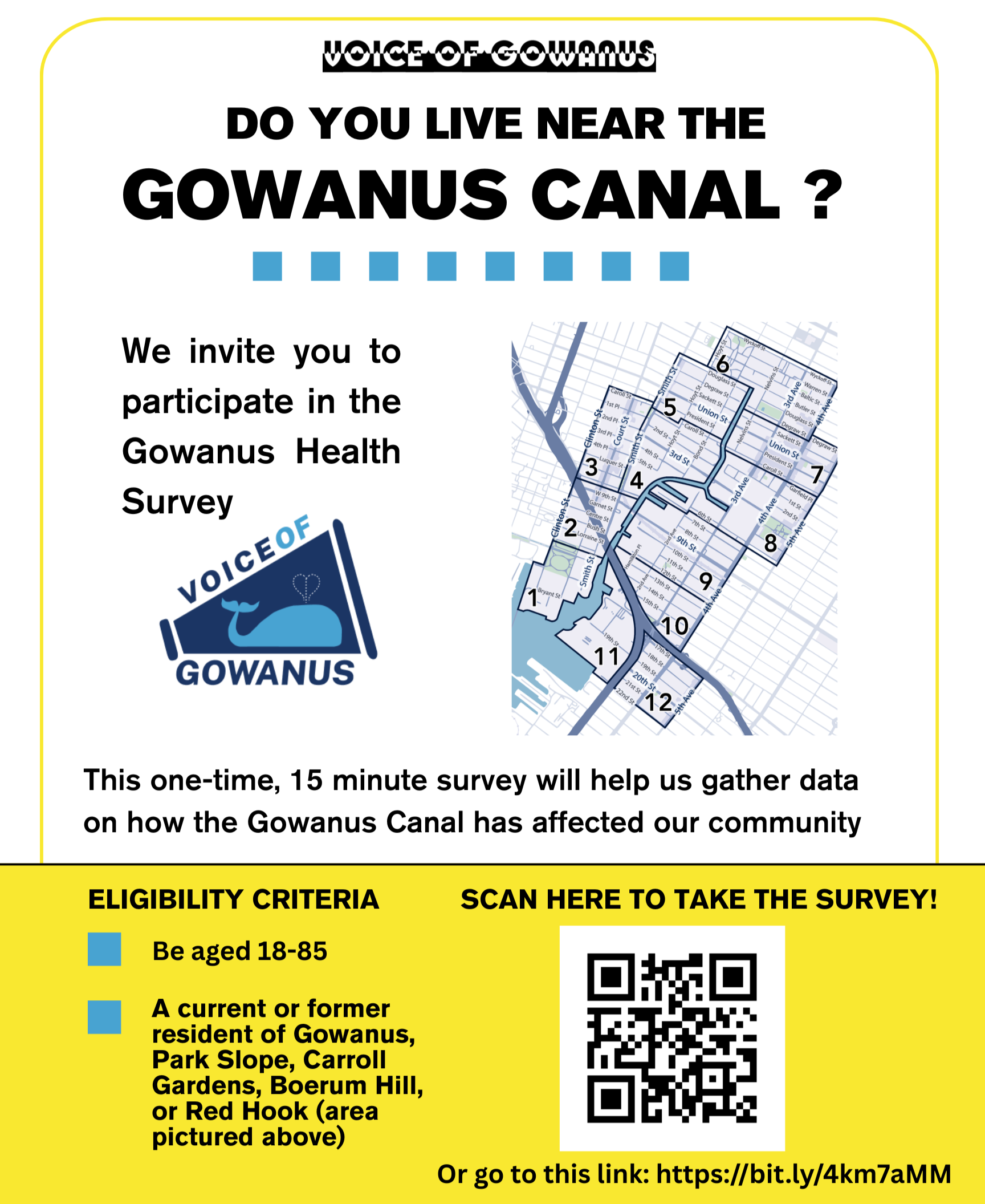 This survey concerns the environment surrounding, health of, and perceptions of the Greater Gowanus community as it relates to legacy toxicants, such as those at the Gowanus Canal Federal Superfund site and the surrounding NYS Superfund and NYS Brownfield sites, as well as the NYS Dept. of Environmental Conservation (DEC) Soil Vapor Intrusion (SVI) investigation area. We want to know if and how the people of Greater Gowanus have been affected by the chemicals we know are in the ground and in the air, substances like trichloroethylene (TCE), benzene, toluene, and ethylbenzene (BTEX), and other industrial contaminants that have persisted in the area’s soil for over a century.